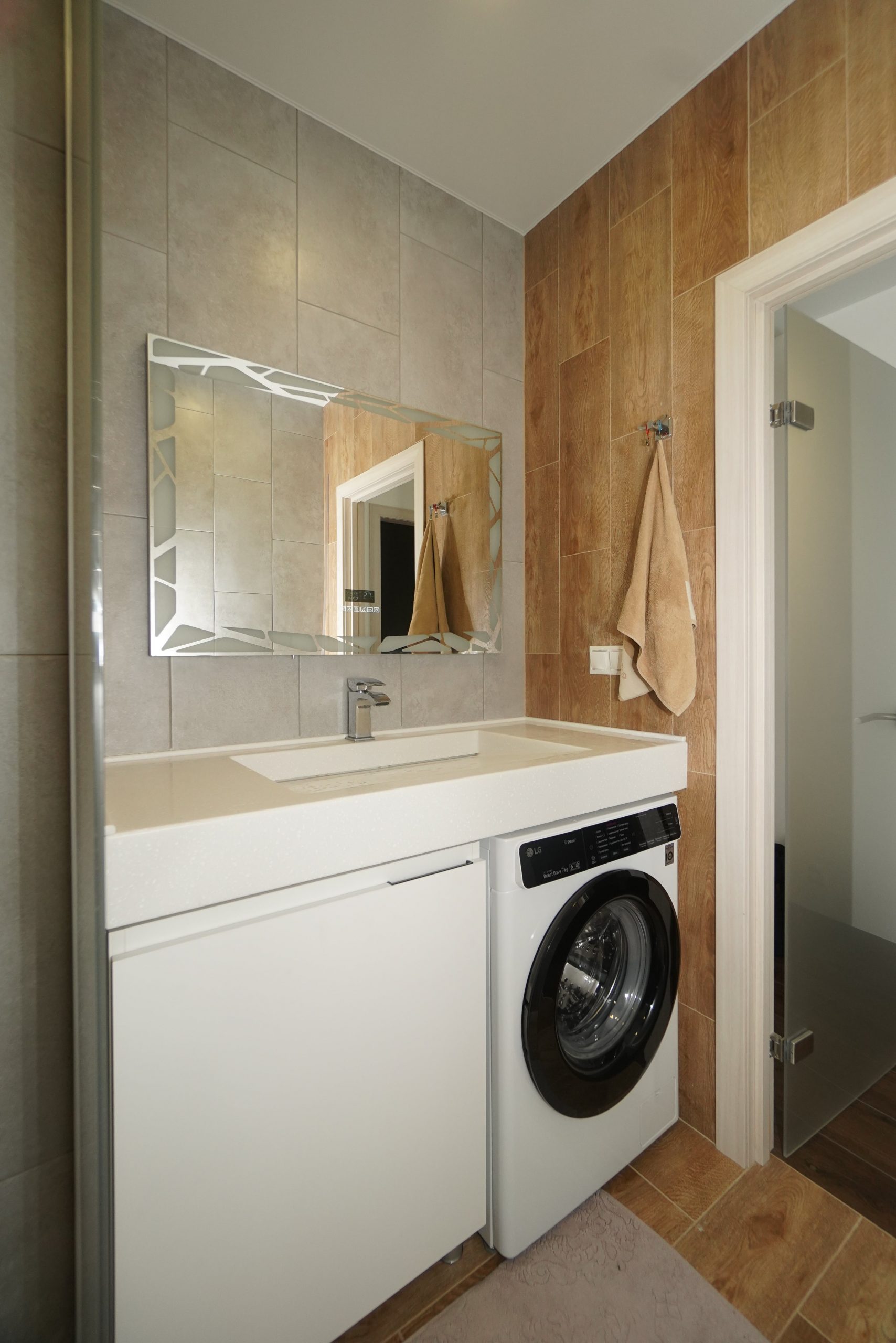 - Перегородка, разделяющая кухонную зону и гостиную, облицована широкоформатной плиткой